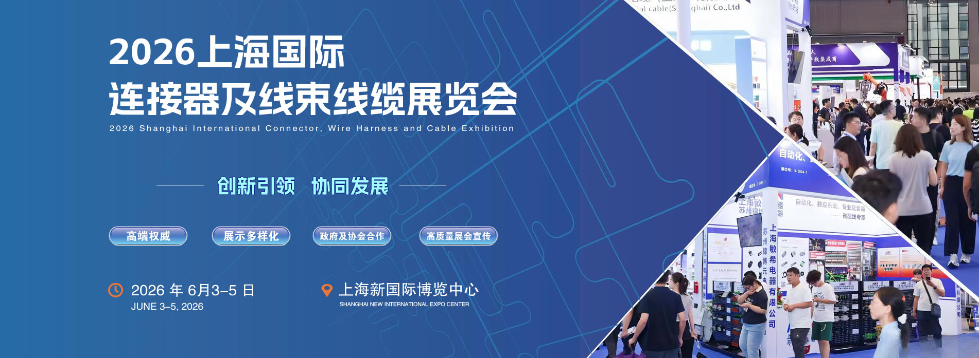 “2026上海国际连接器及线束线缆展览会”将于 2026年 6月3-5 日在“上海新国际博览中心 ”与工业自动化及机器人展同期同馆举办。预计展出面积 40000 平方米,将汇聚来自世界各地的近 600 家企业与 5.5 万多人次的国内外观众齐聚一堂。30 个国家和地区的采购商将活跃在展览馆进行贸易洽谈;为期三天的展览 会是开展商务交流、谈判的最佳平台。展会期间将举办多项主题活动:“高速线缆组件&连接器研讨会 ”,“连接器企业和主机厂商贸配对活动 ”,“连接器行业智能制造创新发展论坛 ”,“连接器与相关产品技术讲座 ”,“推荐优秀供应商活动 ”等;探讨连接器与线缆线束市场的最新发展趋势及新技术应用等。展品涵盖连接器、接插件、电线电缆、线束及配线器材、线束加工设备、精密测试、原辅材料等领域。展现的新产品、新技术、新材料、新工艺及新装备,将代表世界连接器及线束相关产品的最新发展趋势。
